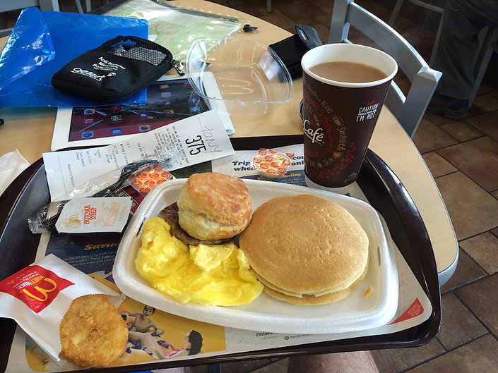 During the day I would also try and eat something substantial and like many tourers then I hope to find a McDonalds: they offer quick hot tasty and value for money food (chicken for me!), wi-fi, seating, air conditioning and table for loads of clobber and clean loos! Frankly when I am not touring then I wouldn’t eat food so high in fat.