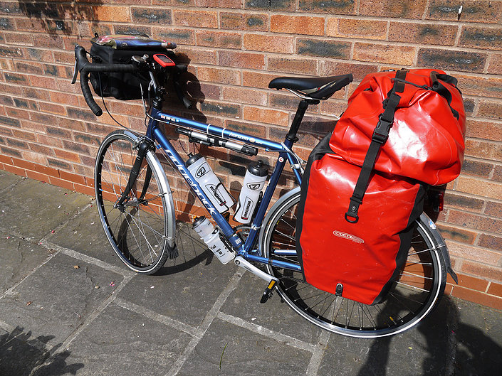 Bike – Airport baggage handling had done horrid things to my original Raleigh Royale and so I never felt the imperative to splash out lots of dosh on something special. So I now tour on a Ridgeback Horizon which is mainly a lightweight tourer designed for Audax. However, I have upgraded the most important components – the wheels and tyres. I have Mavic A719 rims and I use Continental Top Contact tyres. These are 32 spokes and I cannot imagine that 36 spokes are vital unless you are carrying stupid weights and riding off road. The saddle has been switched to something I rescued off an old road bike when the last saddle disintegrated and I have changed the handlebar stem so that I can raise the handlebars to a height that can ease my back. Lastly, I use SPD pedals with clips/cleats on one side and a flat pedal on the reverse – this means that sore feet can rest without being fixed in place for a few days respite.