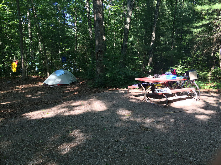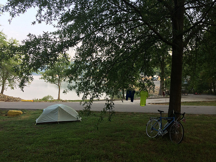 Eventually I got to the environs of Toronto (not that one) and cycled off route to get to one of several campsites that this State Park offered around the lake. The helpful lady said I could stay but really I should stay at another campsite on the lake and produced lots of maps to point out where it was. By this stage I had cycled 95 miles and felt that stopping anywhere (including pitching my tent just in front of her counter and collapsing into it) was a good idea. However being Mr Agreeable (again) I duly departed for the other recommended site. So 8 miles later I arrive at the other site on this lake. Cold shower as well but a very quiet night.