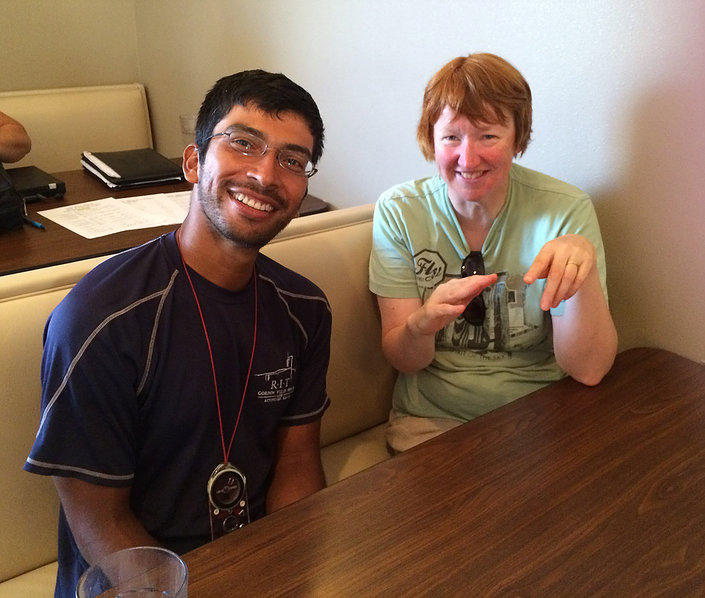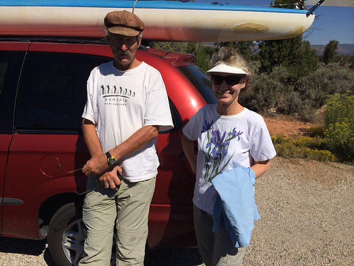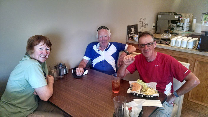 Scrubbed I face the heat and go looking for some lunch. Behold I see a bicycle and inside are three people who are cycling including a legend. It seems so long since I have seen a cyclist let alone had a long chat. Catherine and Jim ‘Legend’ McTaggart are crossing West to East. Jim has done this twice before and I expect that he won’t mind me adding that he is a septuagenarian. I had read his previous blogs and his route, spirit and practicality had been an inspiration when I was looking at my project. Catherine was on her first long USA ride and was going about the challenge with enthusiasm, energy and a cheerful approach, I can think of a few wives who would be in awe of her!