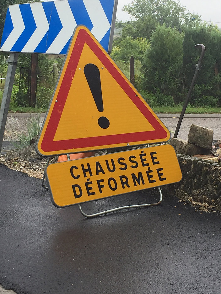 Eventually the motorway became too wearying and monotonous and in the late afternoon I find some side roads and look for a campsite. The car is bliss on windy smaller roads providing the road surface is good. The two most horrifying words in French a Morgan driver can see are in the photo below: