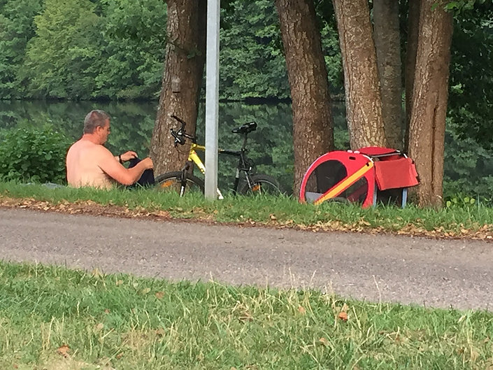 A chap on a mountain bike comes into view pulling a child carrier trailer. In the trailer is fido. However within the trailer are no tent, cooking equipment, clothes etc. So this deranged cyclist finds a tree next to the river to shelter under (a good idea given the heatwave and tropical rain storm combination) and unfurls his sleeping bag, ties up the dog and then goes to sleep. Surprisingly he’s still there the next morning despite the considerable risk of his rolling into the river and floating downstream to the lock.