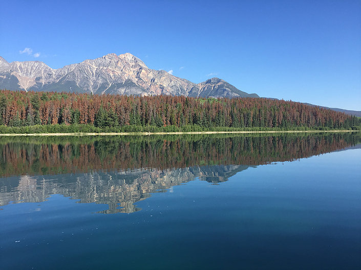 Jasper is small, mainly summer driven, resort overwhelmed by Brits, Germans and Chinese. It is on the famous Canadian Railway line and hosts the tourist train that pulls through every day. It is also ideally located for local lakes – Maligne, Pyramid and Patricia. It’s on the latter that we stayed in a log cabin. (Just to return to an earlier theme, then on Lake Pyramid you could hire canoes by the hour – $40). We tripped out to see the lakes and absorb the beauty. It was chilly and overcast for some of the days and the beauty is cast into monochrome only to fully hit you when the sun comes out and glorious Technicolour abounds.