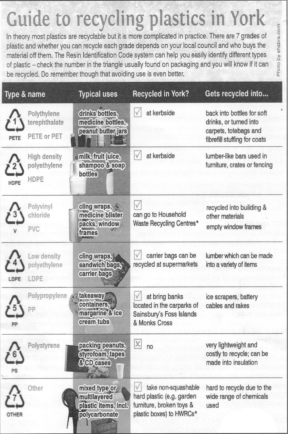 Recycling is a very good idea. City of York Council’s advice is that only plastic bottles can be recycled and placed in your recycling containers. The rest can be taken to various recycling locations around the city. The following guide is for York. Of interest is the triangle and number stamped on the bottom of most plastic containers – this secret unlocks the mystery of what you can do with your waste: