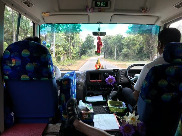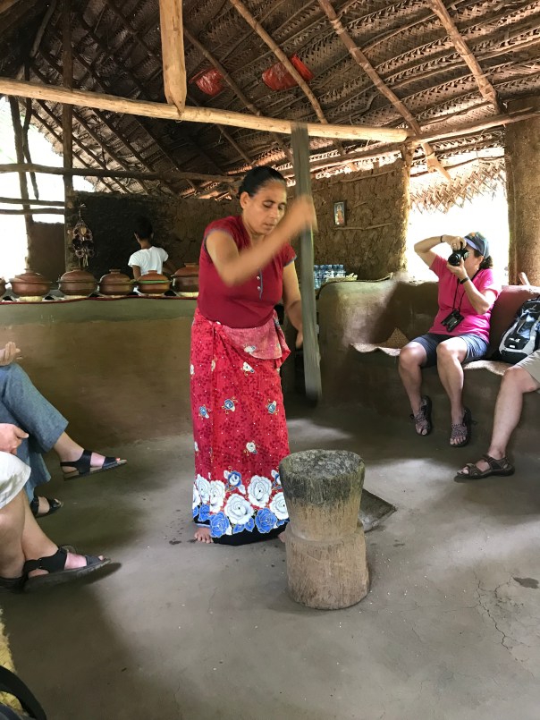We were on the road to Habarana. This has place has a preserved traditional village. Here we’d see the plants, the farming, go for a boat ride on their lake, ride in a cart pulled by bulls and then have a traditionally prepared lunch in a hut. All very unique and interesting. On the road Prabash gave an introduction explaining how a farmer first found the land and prepared it for living and farming. He said the land needed clearing but they always left one big tree. Why? It was left in case there was a rampaging elephant or elephants. When this happened you could climb the tree to escape the trampling. Mind you, it had to be a strong tree!