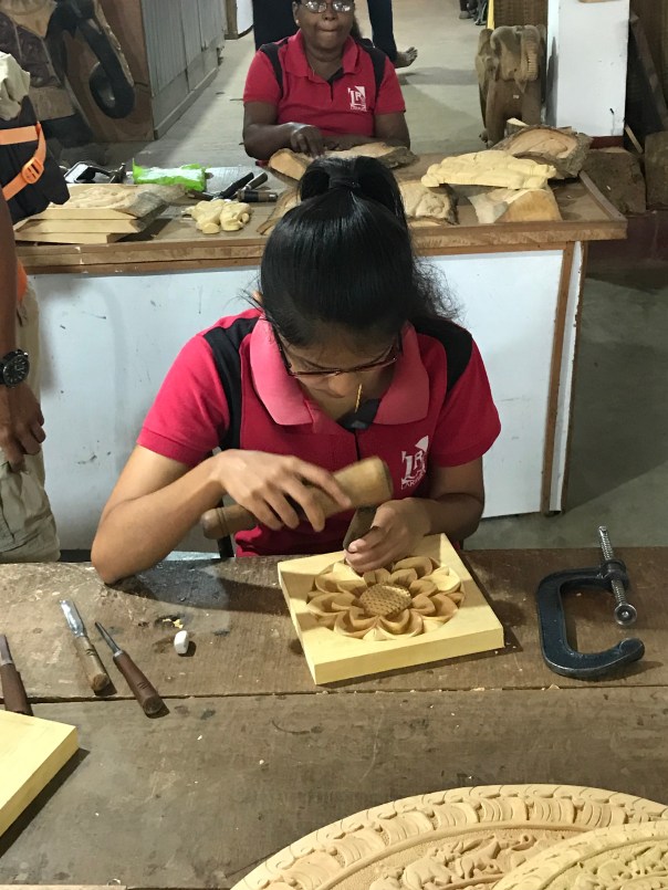 We get these facts and commentaries from Pabash as we drive along. (It is beyond doubt that his thought for the programme and care for each member of the party is immense). Today we were off to Kandy and it was our usual brisk morning start. The first stop was wood carving. We had the local species of wood explained to us and their uses. I asked if any of these wood species were protected by environmental legislation? I was told that they replant to compensate for the depletion. However, how long does it take to grow an ebony tree? I’m not convinced there is serious protection of these scarce resources. This solution seems ineffective if even true. All the wood working and painting was top class.