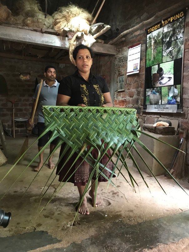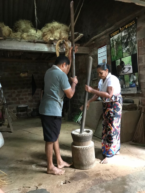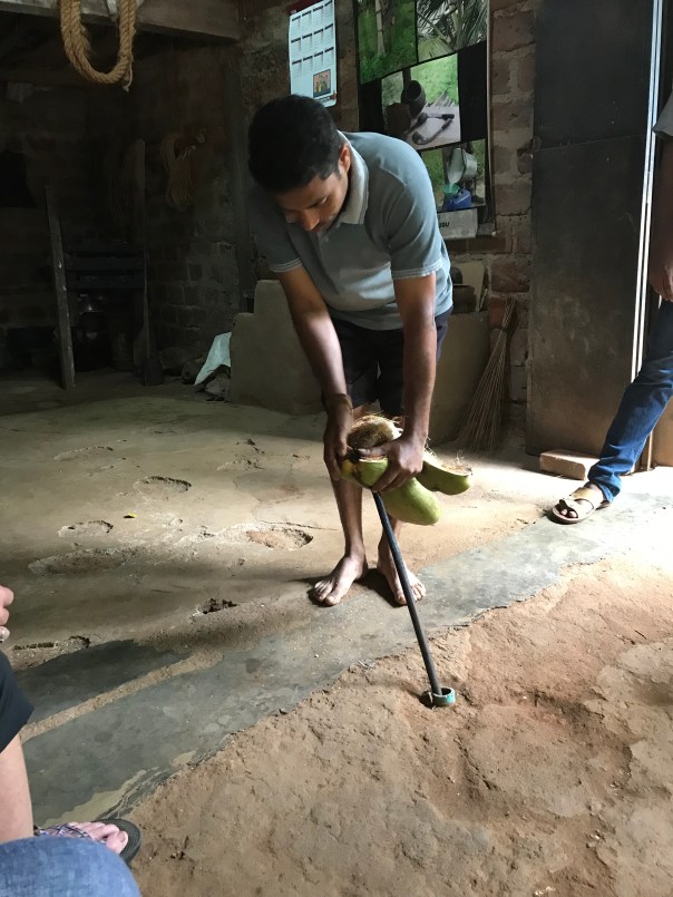 Back on the bus we next stopped at a small shed/lock up garage and saw the many uses of coconut and its tree. These included – food, alcohol, oil for lights, vinegar, roofing, rope, mats and cooking utensils from the shells. Quite amazing. This host family of man and wife, child and mother put on a slick show demonstrating how they used the flesh, leaves, shell and liquids to make all these things. We were enthralled.