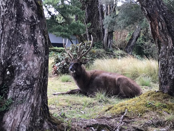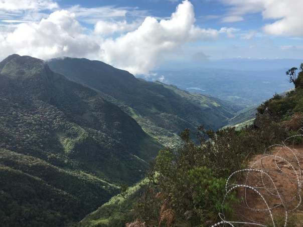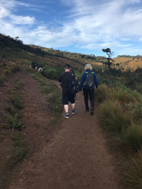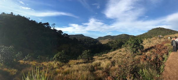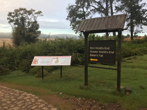 We set the alarm for 4.40am. This lunacy facilitated a one hour drive to The Horton Plains National Reserve. In the dark a fleet of mini vans raced up the winding road in the dark. It was like being at the back of a Formula 1 Grand Prix. Vans overtook where the narrow road did or didn’t allow and we were thrown around. On rail crossings, on pieces of road with sheer drops or where they could wind up their tired old trucks to sufficient speed to race past each other. Needless to say the hotel’s pack up breakfast could be eaten or worn as we ascended. At the top we joined 20 or 30 other vans in a undisciplined line to get into the park. This madness meant an inexplicable traffic jam for 40 minutes wondering what was going on and watching dawn break.