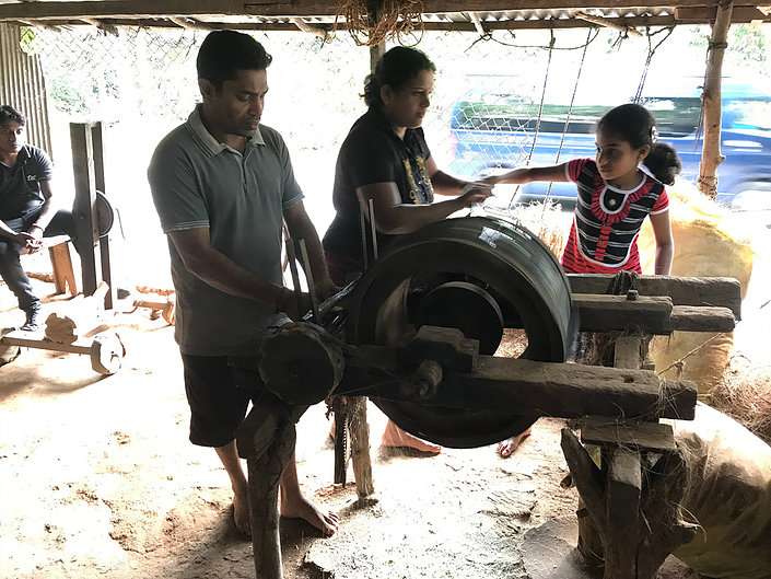 Back on the bus we next stopped at a small shed/lock up garage and saw the many uses of coconut and its tree. These included – food, alcohol, oil for lights, vinegar, roofing, rope, mats and cooking utensils from the shells. Quite amazing. This host family of man and wife, child and mother put on a slick show demonstrating how they used the flesh, leaves, shell and liquids to make all these things. We were enthralled.