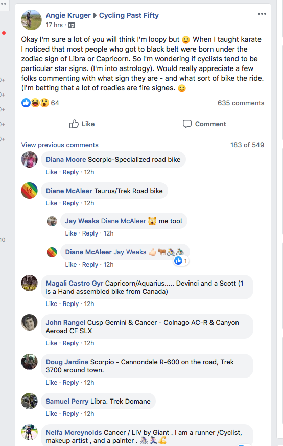 Amongst my several failings is following cycling groups on Facebook. The administrators of these forums instruct members not to be ‘snarky’: I do my best. I draw your attention to the post below about astrology and cyclists. As they say ‘only in America’. My incredulity at this nonsense grew when I look at how many participants willingly contributed.