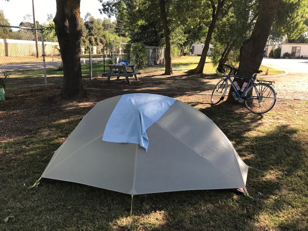 Now weighed down by this lunch I went about the ready supply of hills in front of me. In fact I climbed 900 metres for the day. There were few climbs over 8% but it wasn’t the start the legs were looking for. My campsite in Seymour was fine resplendent with nearby picnic table and benches for organising my dinner and bags.