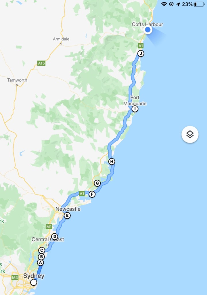 Whilst waiting one of the site cleaners sat with me, also awaiting a cessation. He rides a Harley and commented that he wouldn’t ride it in this weather! He also noted that the Pacific Highway not only provided faster travel up the coast but it was the only link between many of these settlements. It wasn’t possible to access all these small coastal towns any other way. That set my mind at rest that I was pursuing the correct routing option.