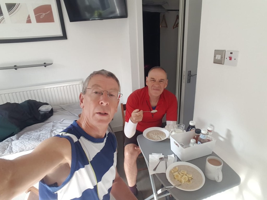 Eating in our room as they’re refurbishing the dining room. (Peter’s too poor to afford a jersey with sleeves or rear pockets.)A bit of air in my tyres