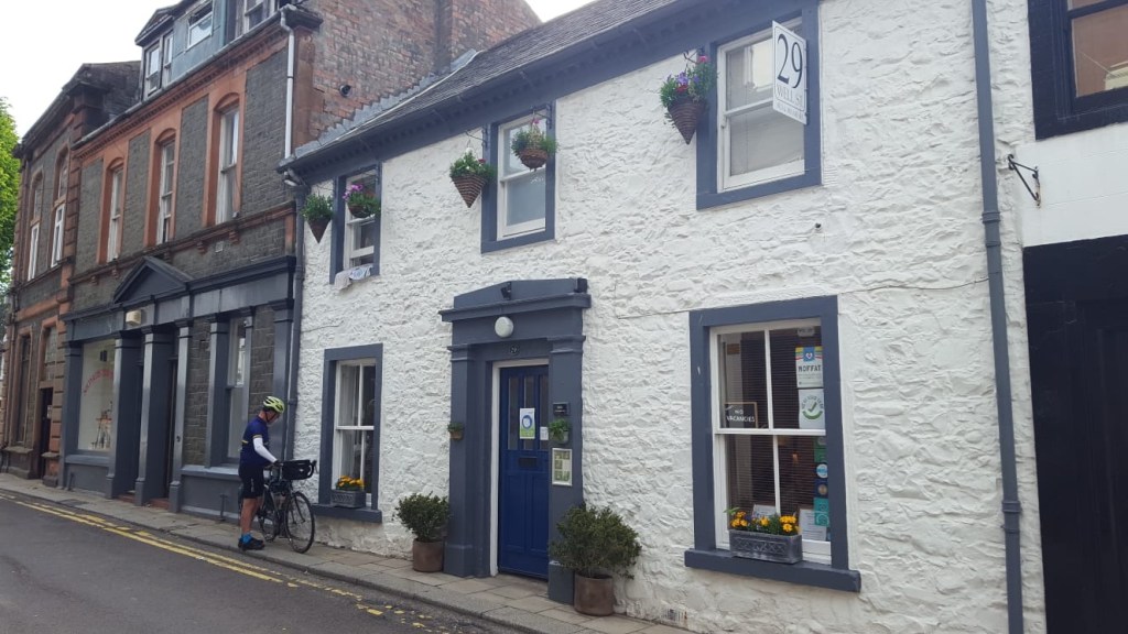 The B&B landlord and landlady were from Kirbymoorside in North Yorkshire. As part of a midlife crisis Mark was sick of being a car mechanic and Dawn was restless; so they bought the B&B after an extensive search. Moffat was delightful as a location but also affordable and when the property turned up they bought it. They were a chatty couple and interesting hosts. The flow of LEJOG cyclists was a nice little earner along with other regulars. In the garage where we stored our bikes he was putting a new engine in an old car for a friend. The ‘friend’ had done them some favour and this barter system seemed to be a way of getting things done round here.