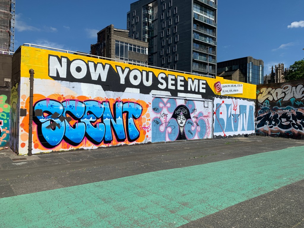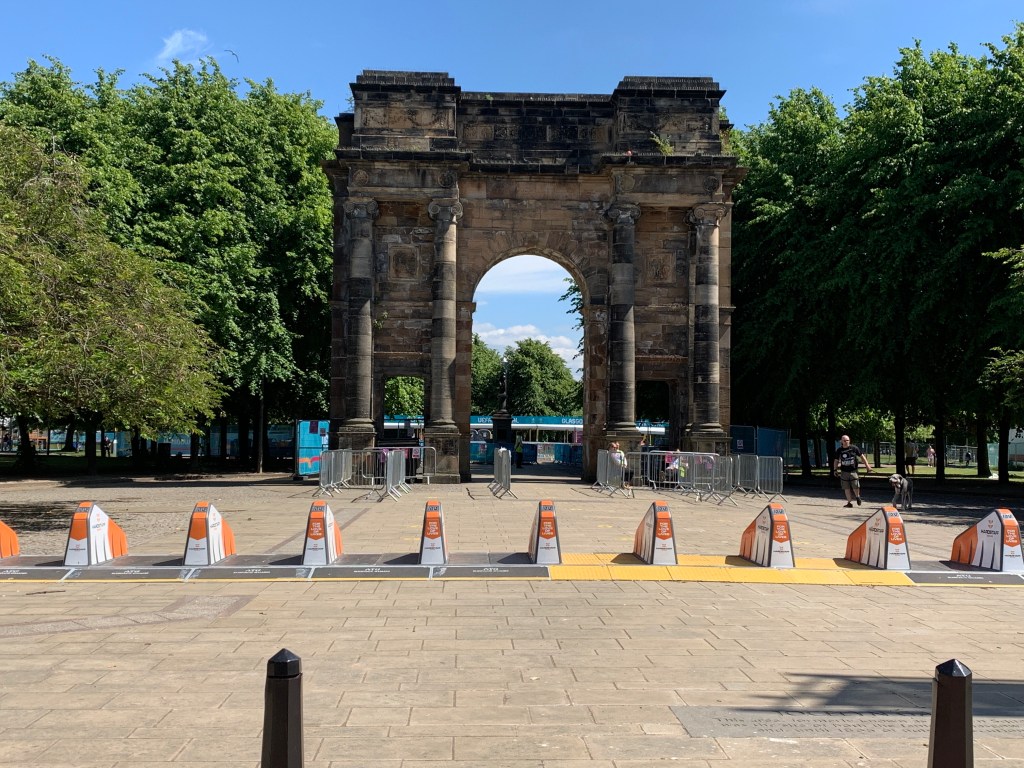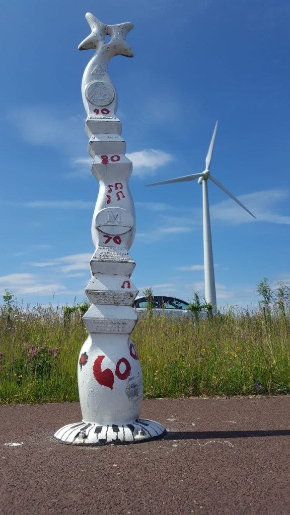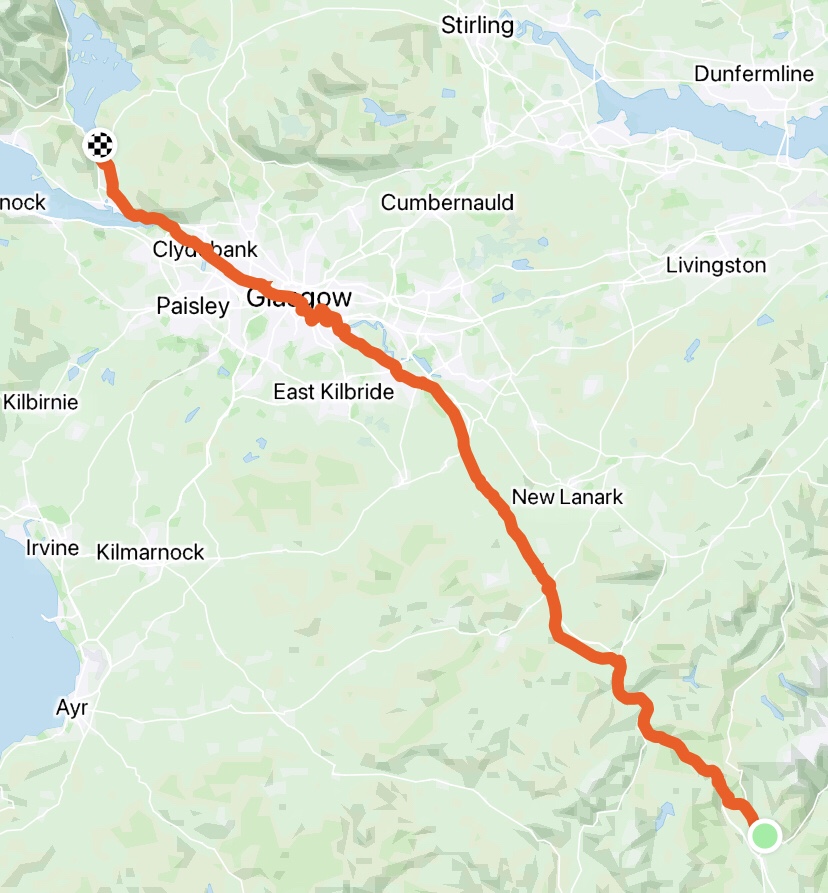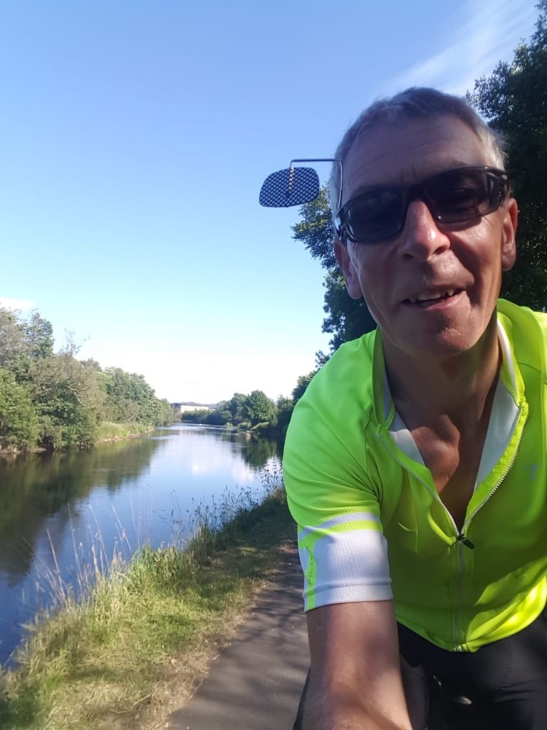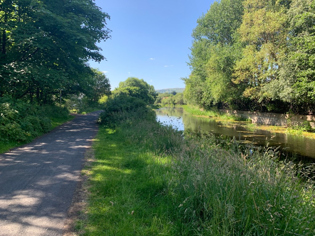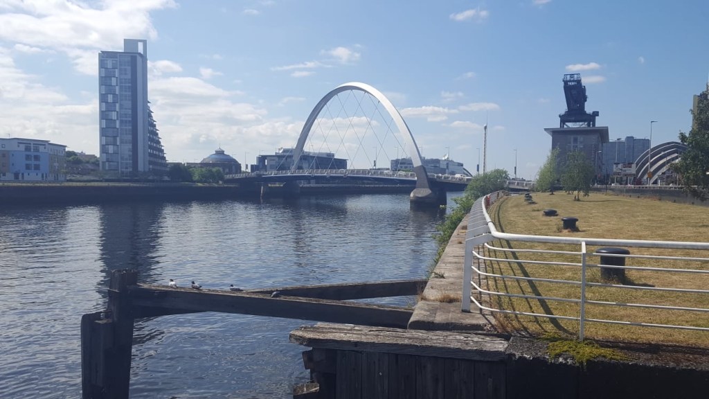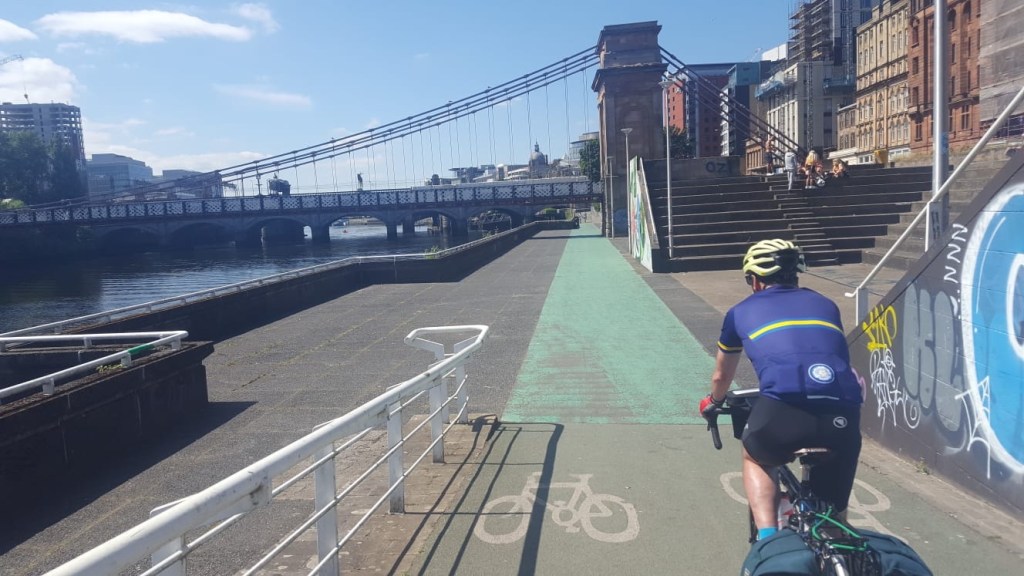 We ate up the miles and started to enter south east Glasgow. The traffic picked up and the sun came out. Oh boy did it! Soon it was sweltering at 28°. On went the suntan lotion! The natives were out in the sunshine looking frankly a little pasty and white. This type of weather doesn’t happen here often I guess. Being a large conurbation we cycled through the suburbs of Larkhill, Hamilton and Cambuslang. The traffic was demanding, switching lanes was always a challenge and the traffic lights came thick and fast. Help was at hand as we turned off to find the Clyde river and a cycle trail.