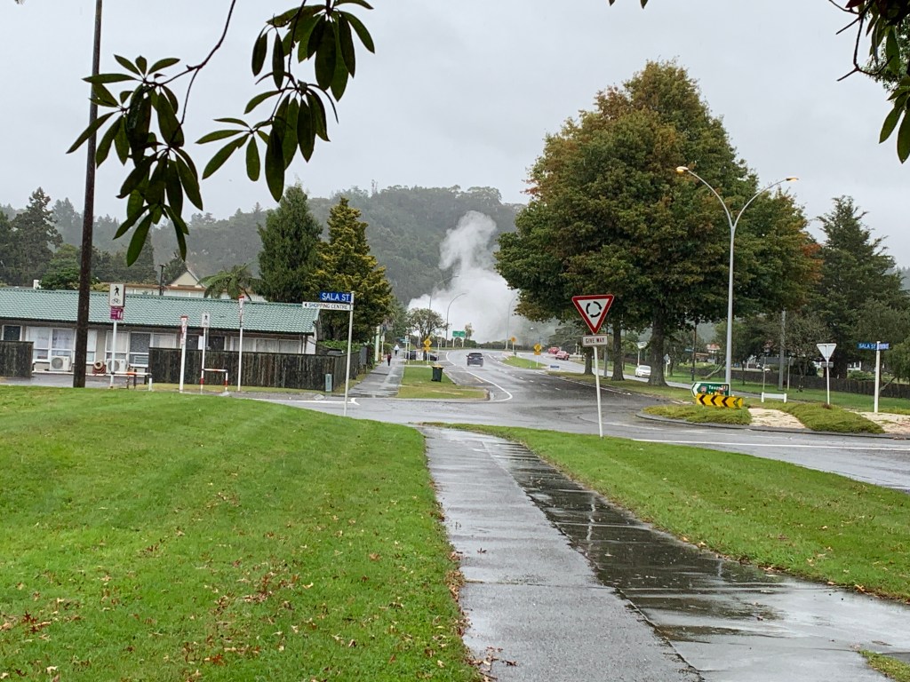 The countryside remained very verdant, and rolling, as rain started to fall. It was the first time in a few weeks since we’d seen the heaven’s open. Rotorua is a largish town of over 50,000 and apparently 80% of the population is Māori. The town sits on the edge of a large lake and has considerable thermal activity. A reminder is the pungent aroma of bad eggs that greets you – sometimes as a faint background smell or occasionally quite halting. As a settlement it has loads of hotels but the town held little charm apart from a striking early 20th Century Bath Hall.