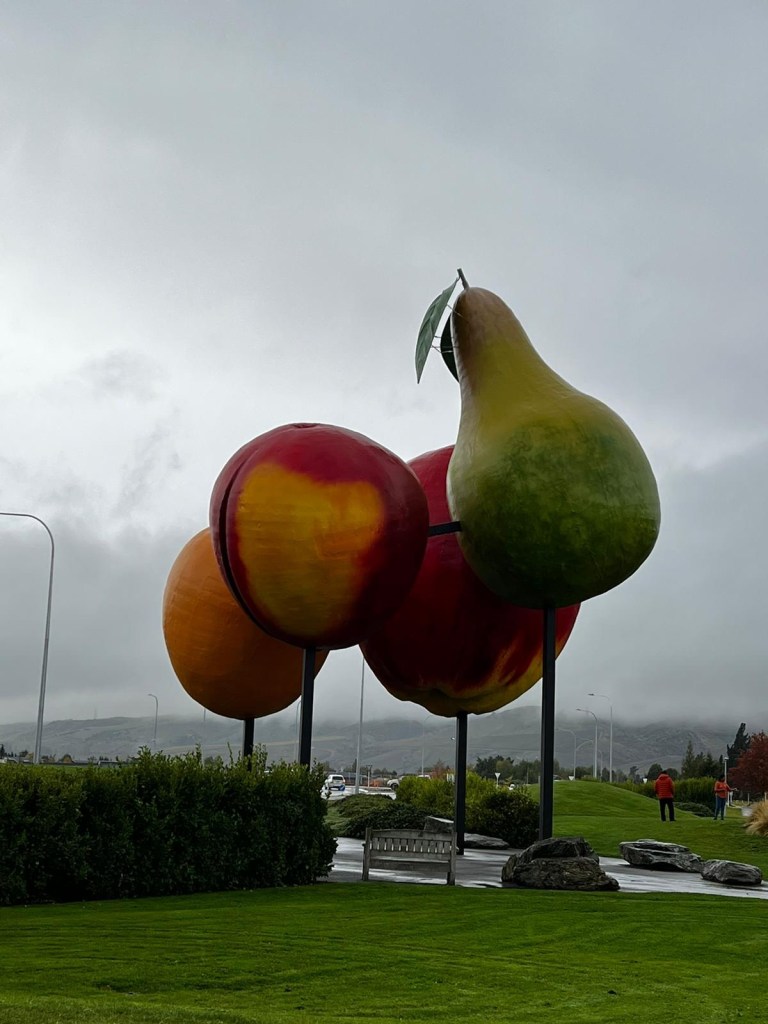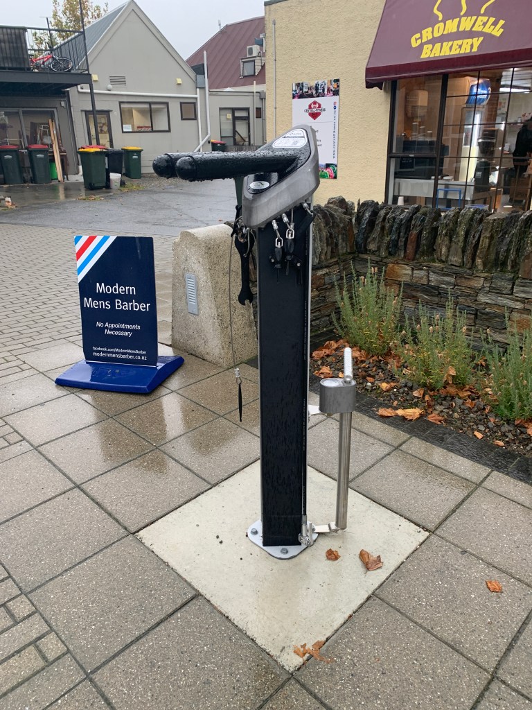 The departure from Queenstown was, in reality, the beginning of the end as we started back north to arrive in Christchurch and a flight home. Today we were heading for Twizel, no not Twizzle, think of the same pronunciation as twilight. The heavens opened on leaving Queenstown but we had few complaints as the weather had been very kind throughout New Zealand with lots of sun and seldom nithering. The road north included a stop in Cromwell where I espied this cycling joy of a tool centre that could help you inflate your tyres or tune up the bike whilst en route.
