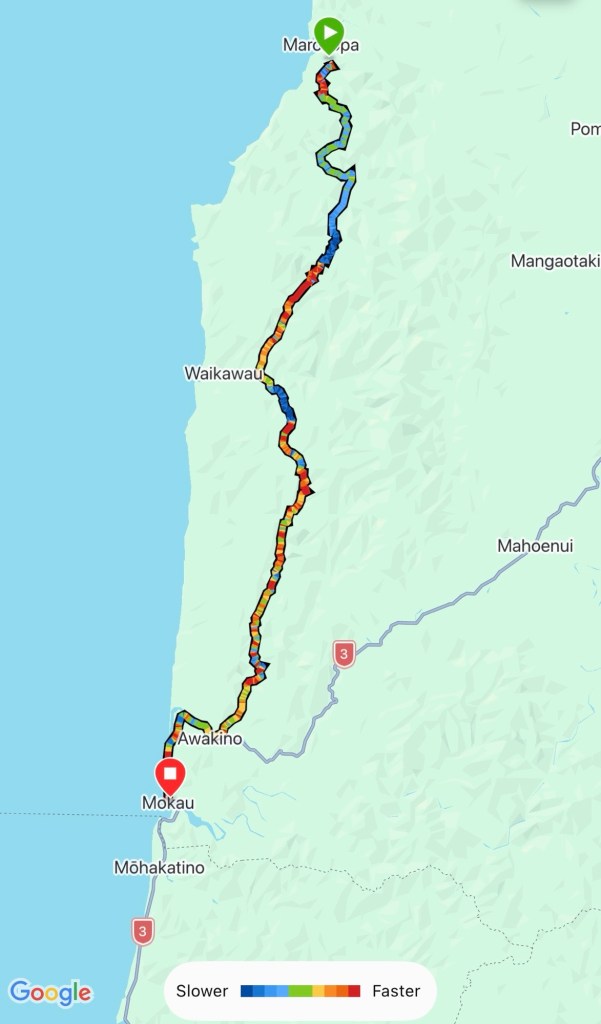 This was not an uncommon sight on all my riding days. I hope that this didn’t involve a vehicle plummeting into the depths. For some time I followed a river and made better progress before I exited this logging route detour and hit the main road to Mokau.