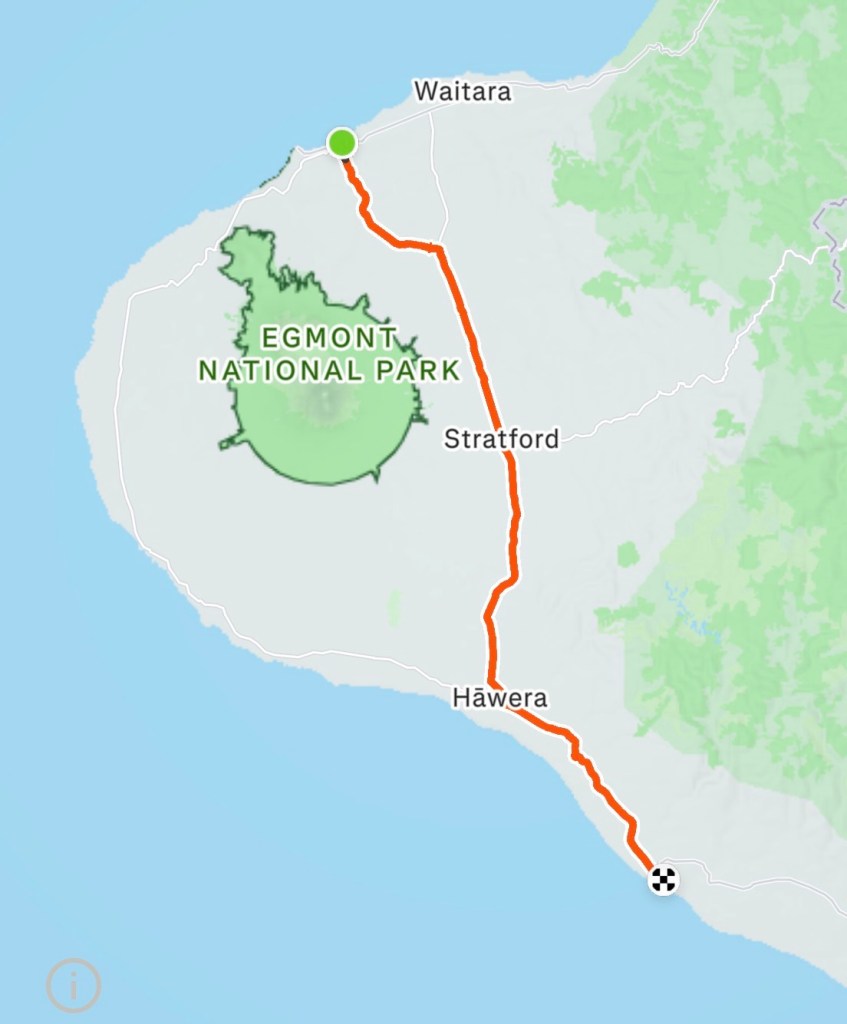 I suppose whilst I hadn’t ridden a bike on my day off I had accumulated 14,000 steps wandering around New Plymouth. It was a splendid town with hot and sunny weather and a stupendous park. However, despite a steep hill to climb away from the coast I felt somewhat restored and looked forward to heading further south.