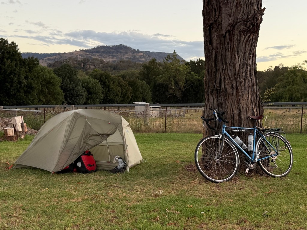 I cycled through an enormous deluge of rain. I got drowned! Eventually I rolled into Murrurundi, a small town at the bottom of an enormous hill… I had to climb the next day. After getting wet through I thought I’d stay in a hotel. The one I found had no rooms and so I camped (!) at a nice little site. Despite the scenic setting there was a main road on one side with 24/7 trucks and a rail line on the other side that ran through the night moving coal. It was noisy. Fortunately I can sleep through most things.