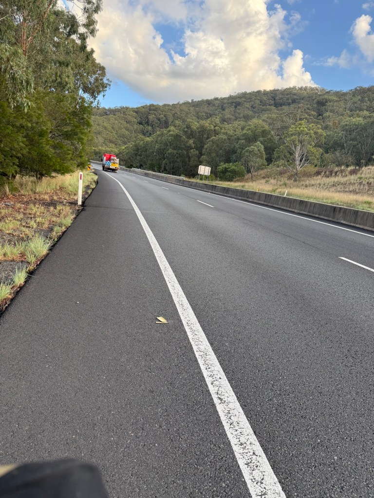 In my blogs I will tell you about the hills but you’d be sensible to think ‘you knew what the profile was and you still went ahead with the trip, shut up’. Of course this is right but the solo traveller, a weary one can stop seeing the wood from the trees as the next hill appears, the temperature is starting to soar and you’re wondering what day you’ll get to fly out of Australia, will it have to involve 10 hour lay overs as you take the only flights available and you can’t resolve this because the airline is understandably dealing with immediate flights and it’ll be a few days before they worry about you. Just past Wallabadah I stopped, sat on some armco barrier at the bottom of a half mile climb scoffed a few Haribos and contemplated the meaning of life before pulling myself together and found the granny gear and trundled up the hill.