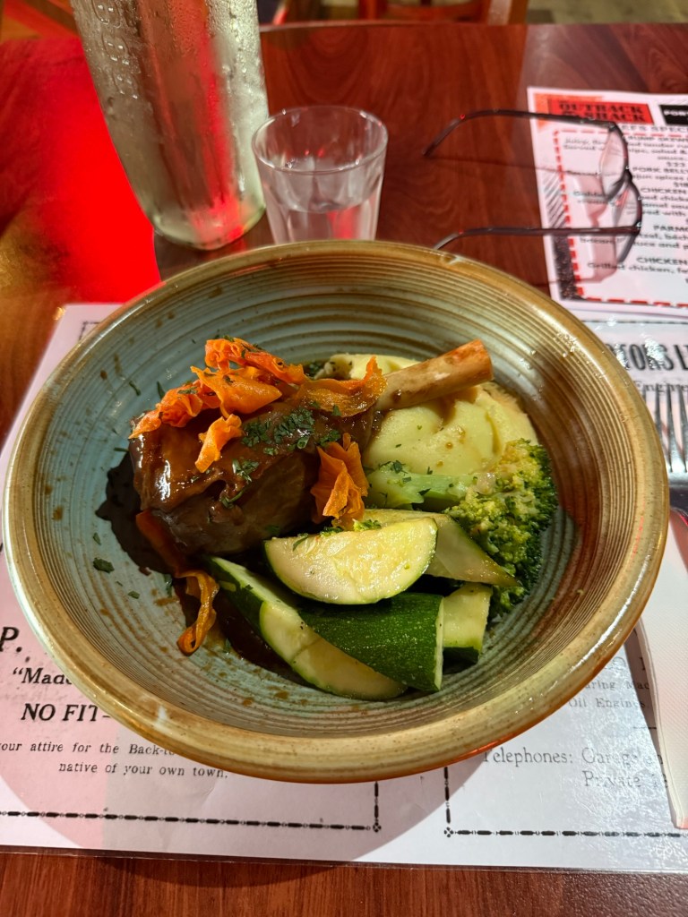I must start with last night’s dinner at the RSL. Lamb shank with proper vegetables! Most restaurant menus I see are generic for rural Australia (and the USA.) Lots of fried food and sugary drinks. I must admit in the pursuit of sustenance and calories I’ve indulged but proper food was a welcome change.